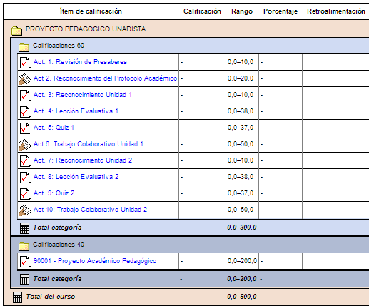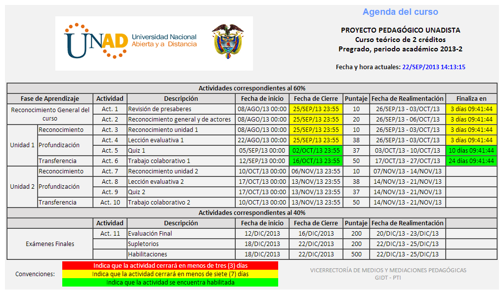 Aquí tu podras encontrar las fechas de apertura, cierre, y realimentacion de cada un a de las actividades que comprenden el curso